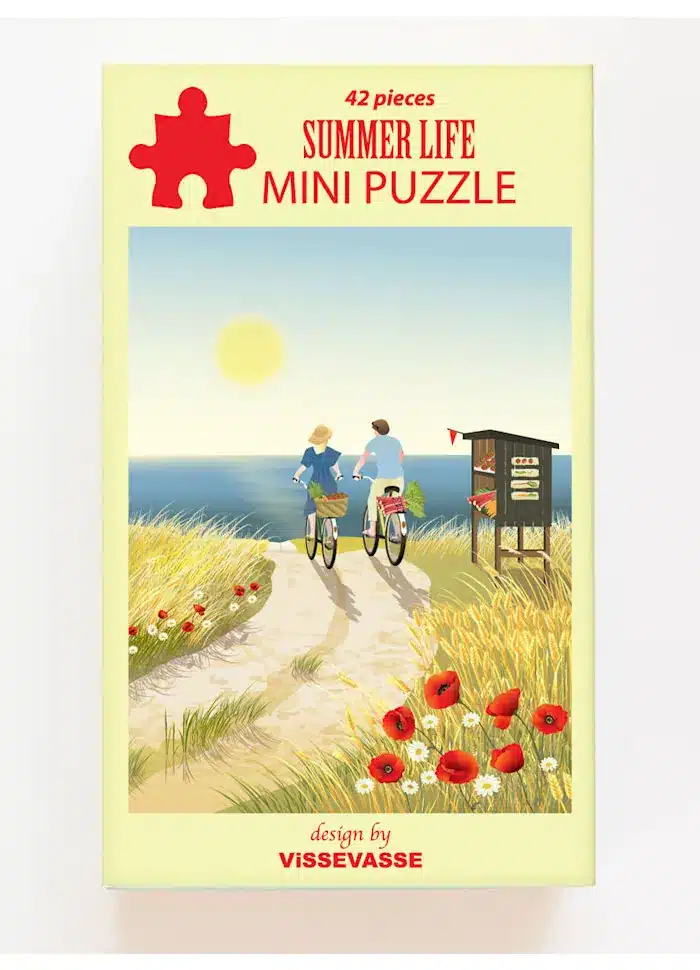 Le mini puzzle Summer Life de Vissevasse de 42 pièces. Illustré par Dorthe Mathiesen, c’est parti pour une balade en vélo lors d’une belle journée d’été. La mer attend les plus aventureux ou l’on peut s’arrêter pour faire le plein de légumes de saison. Retour à la maison par les champs de coquelicots sous le soleil.