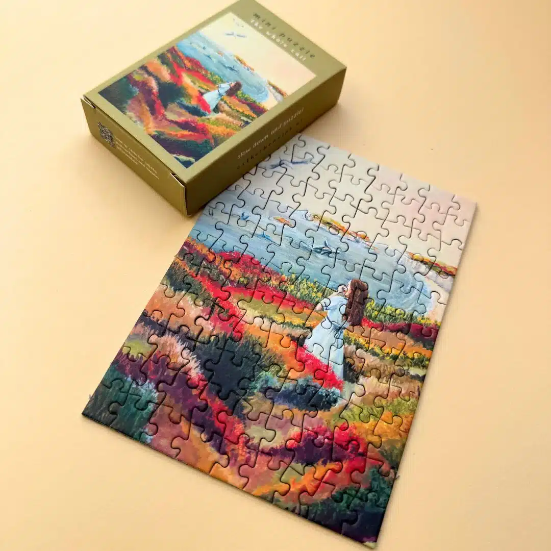 Le mini puzzle Whale Call de Esther Bennink de 99 pièces. ce petit puzzle illustre une jeune femme au milieu d’une vallée fleurie en bord de mer, jouant d’un instrument de musique particulier lui permettant d’appeler les baleines, nous offrant la chance de pouvoir les regarder danser près de la plage.
