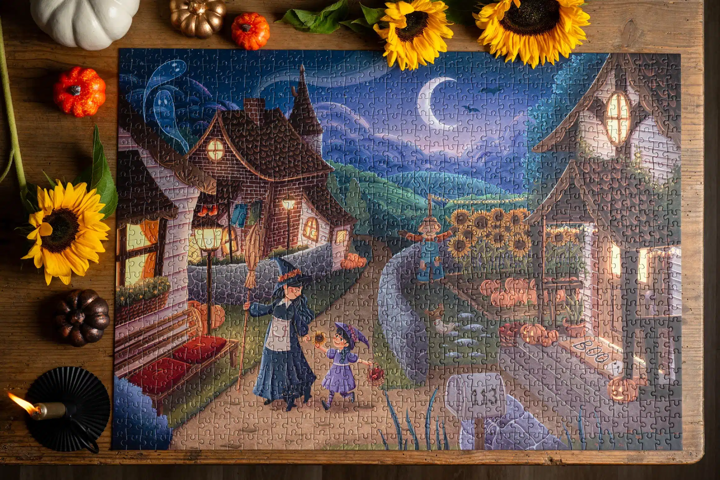 Un puzzle idéal pour Halloween ! Les détails sont adorables. Coup de cœur pour les couleurs du ciel et des personnages 💜