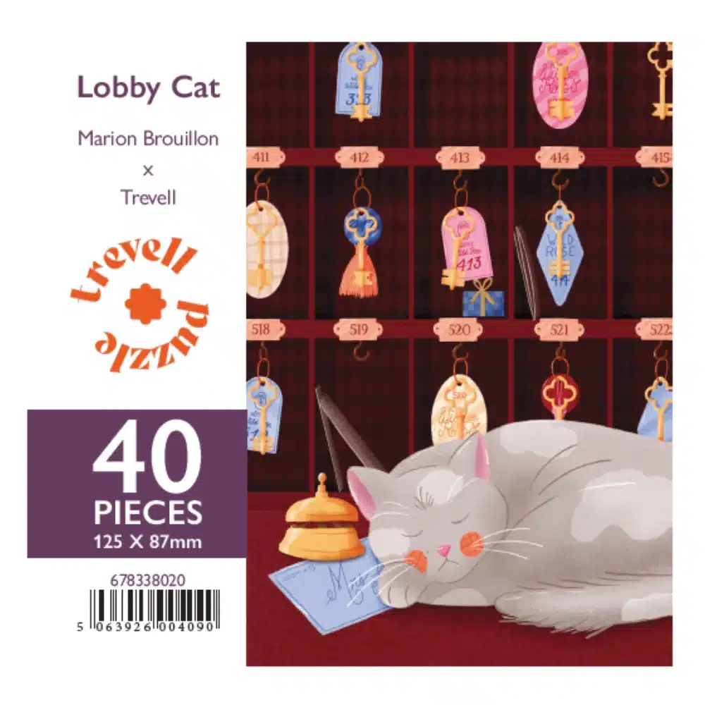 Le puzzle Lobby Cat de la collaboration Trevell x Wentworth de 40 pièces. Illustré par Marion Brouillon, franchissez les portes de cet hotel mais CHUUUUT… Ne réveillez pas le gardien qui n’est autre que ce charmant chat gris. Attendez patiemment que l’on vous attribue votre chambre, profitez des ronronnements et appréciez le silence du hall d’entrée.