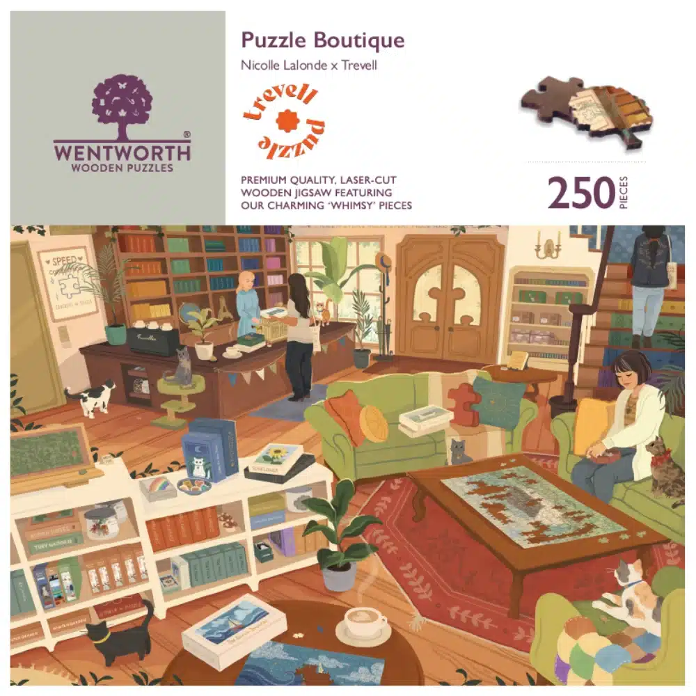 Le puzzle Puzzle Boutique de la collaboration Trevell x Wentworth de 250 pièces. Illustré par Nicolle Lalonde, poussez les portes de ce magasin où les puzzles se mêlent à la joyeuse compagnie de chats. Installez-vous sur le canapé, avec une boisson chaude pour assembler un puzzle… mais attendez-vous à entendre ronronner tout près. Montez à l’étage pour découvrir plus de puzzles (et de chats).