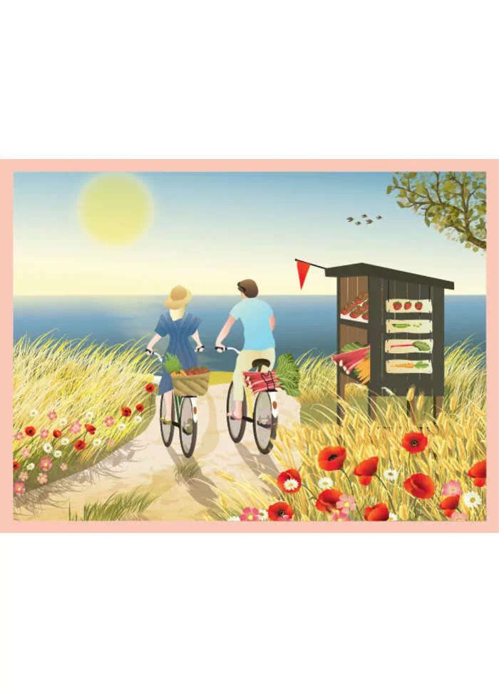 Le puzzle Summer de Vissevasse de 300 pièces. Illustré par Dorthe Mathiesen, ça vous dit une petite balade en vélo ? Profiter d’une belle journée d’été pour rouler jusqu’au bord de mer. On peut facilement imaginer que les fleurs sauvages et peut-être quelques champs ont été traversés pour arriver jusque là. Le soleil accueille les vacanciers bien volontiers. Un self service de légumes est présent, de quoi repartir de la plage avec des produits frais.