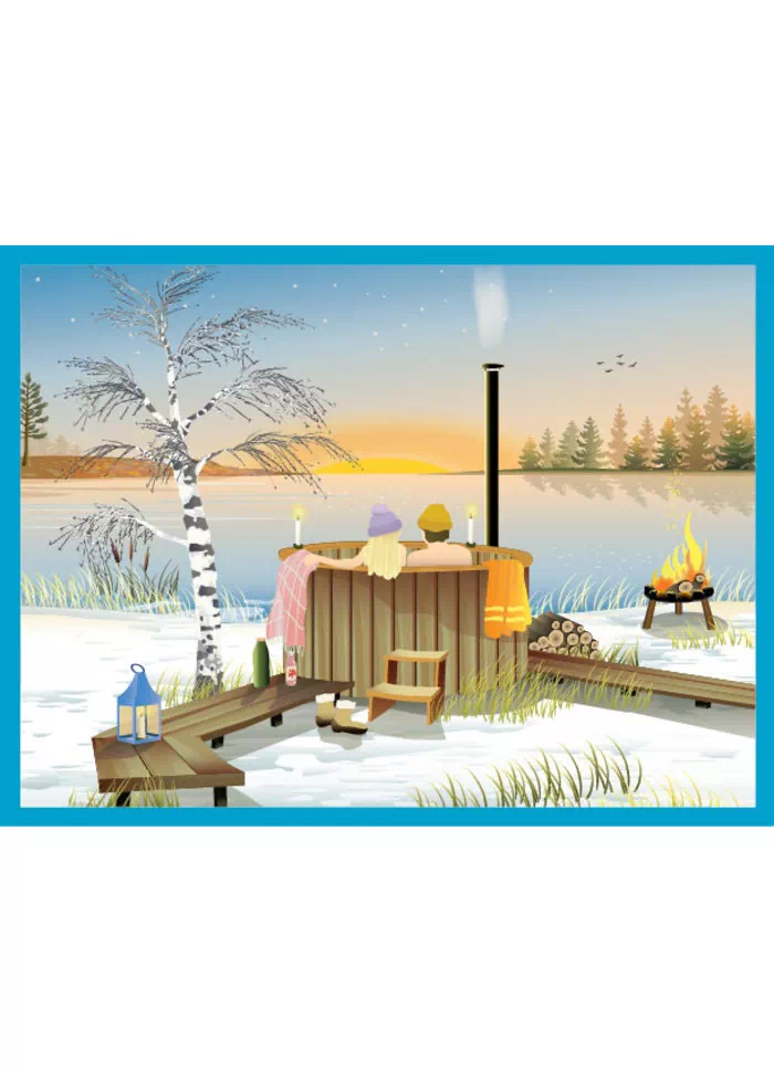 Le puzzle Winter de Vissevasse de 300 pièces. Illustré par Dorthe Mathiesen, rentrons vite dans le bain extérieur. L’air est frais et la neige tient encore bien au sol, le spot est idéal pour observer et profiter du coucher de soleil. L’immense lac entouré d’une forêt de sapin offre un panorama à couper le souffle.